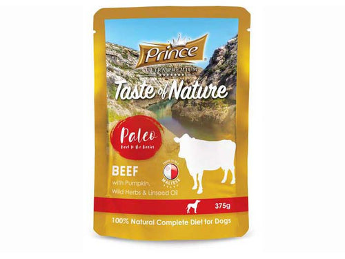 Prince Taste Of Nature Wet Dog Food Pouch Beef with Pumpkin Wild Herbs And Linseed Oil 375g