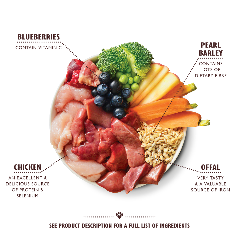 This complete recipe is a truly delicious dish, made with fresh chicken and turkey, plus brown rice, vegetables and fruits - apples, broccoli, peas and blueberries - and healthy herbs.