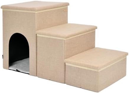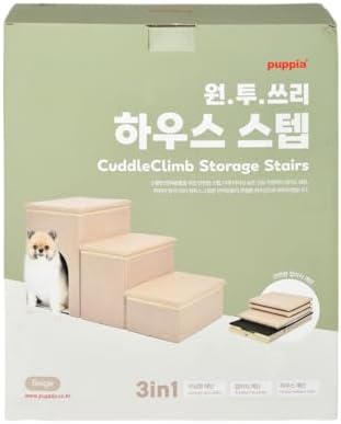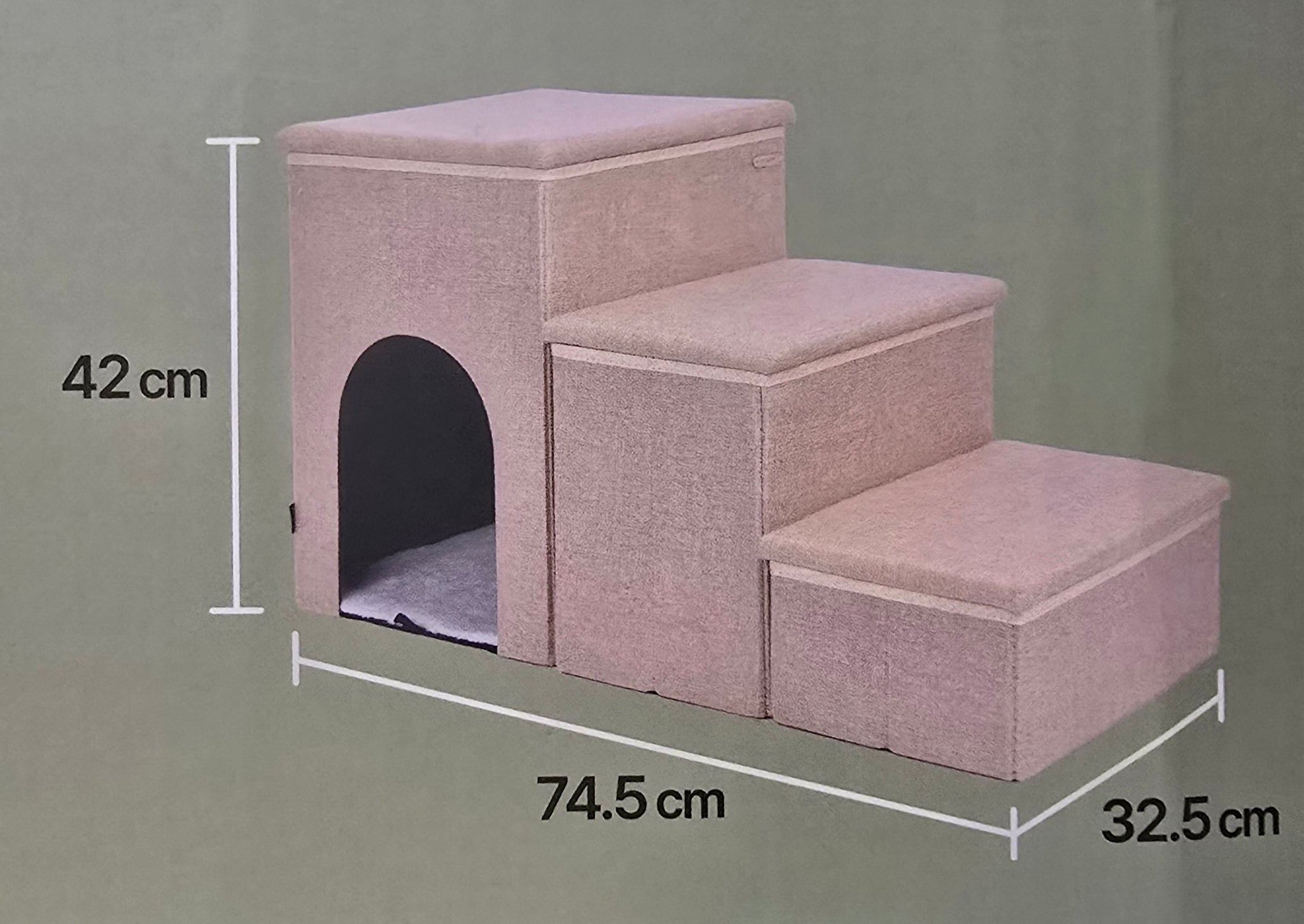Polyester 50% MDF 40% Foam 10% Space-saving folding ladder with sturdy three-tier structure, with kennel space and two other containers to keep your dog's accessories tidy. Safe and comfortable with sponge reinforcements. Velcro connections allow height adjustable use for easy access to bed or sofa etc. Luxurious design and colour suitable for every decoration style